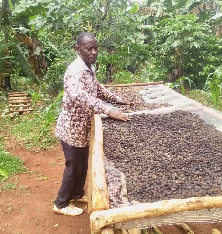 Pictured: Moses used his microloan to build a raised surface for drying his coffee beans, improving their quality.